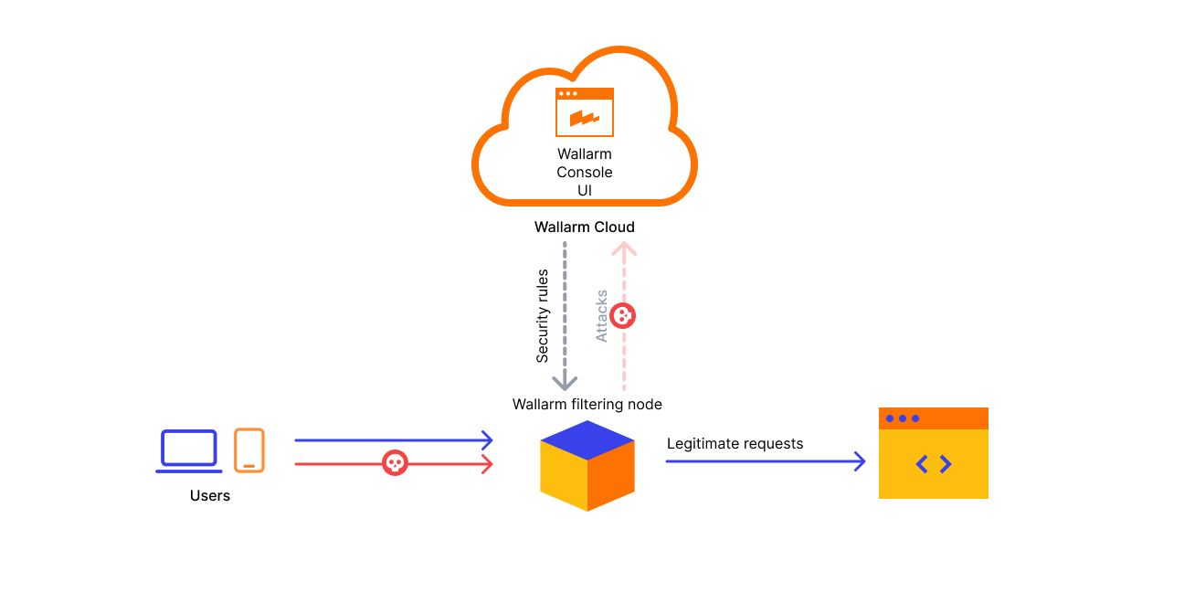Traffic is handled by two components: Wallarm filtering nodes and Wallarm Cloud. Wallarm filtering nodes are deployed in the customer's infrastructure and are responsible for analyzing traffic and blocking attacks. The collected attack statistics are sent to Wallarm Cloud for statistical analysis and event processing. Wallarm Cloud is also responsible for centralized management and integration with other security tools.