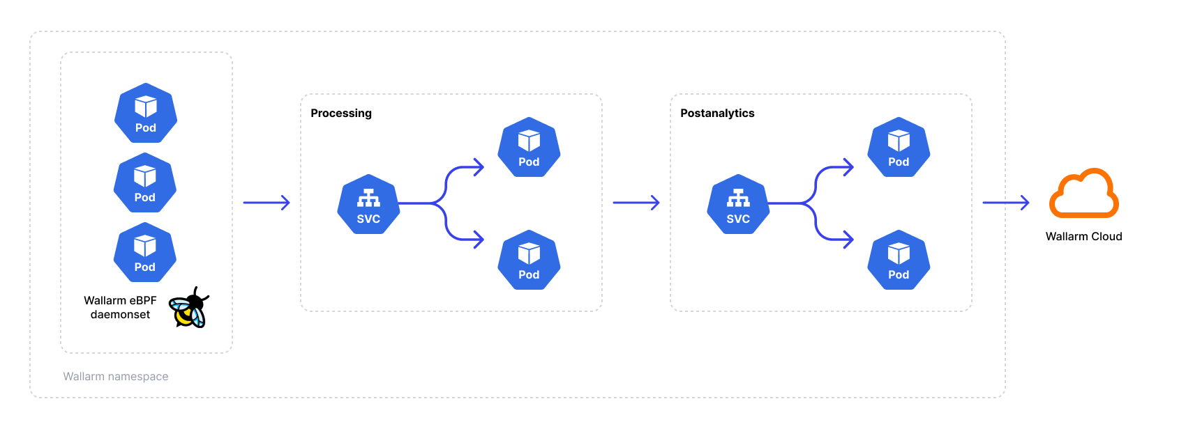 Among all supported Wallarm deployment options, this solution is the recommended one for out-of-band operation. By capturing a mirrored copy of traffic instead of operating in-line, the eBPF-based solution ensures uninterrupted traffic flow. This approach minimizes the impact on live traffic, and avoids introducing extra delays that could affect latency.