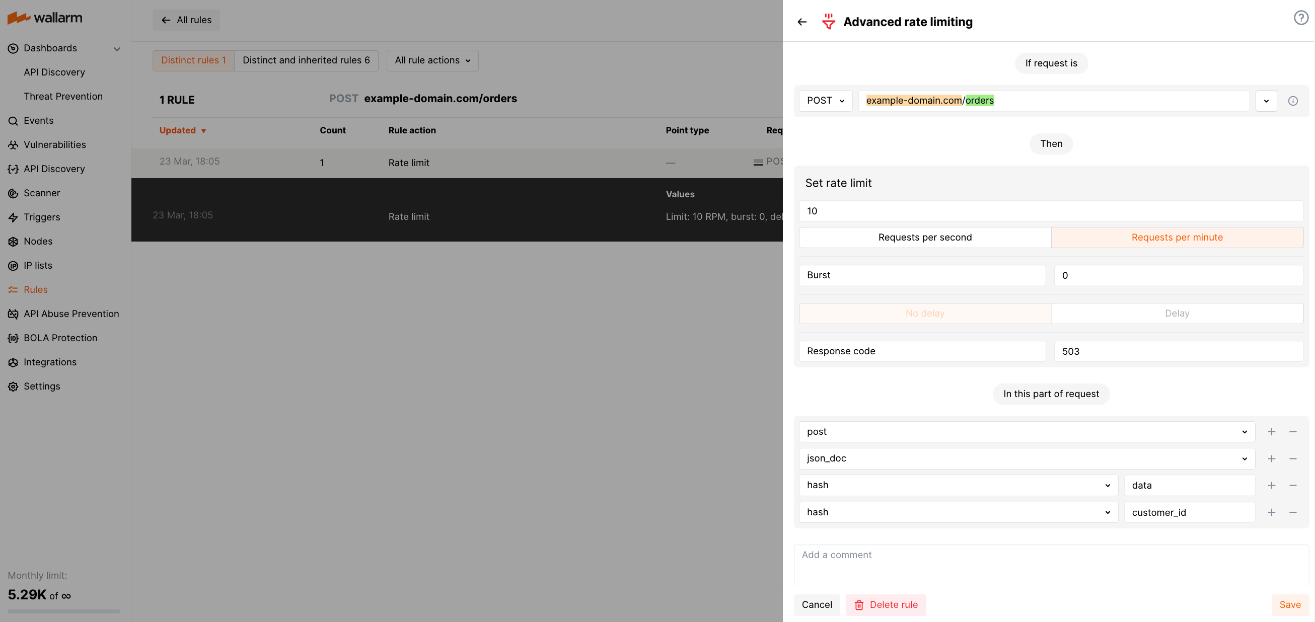 For example, the rule limiting each customer by 10 POST requests per minute to https://example-domain.com/orders