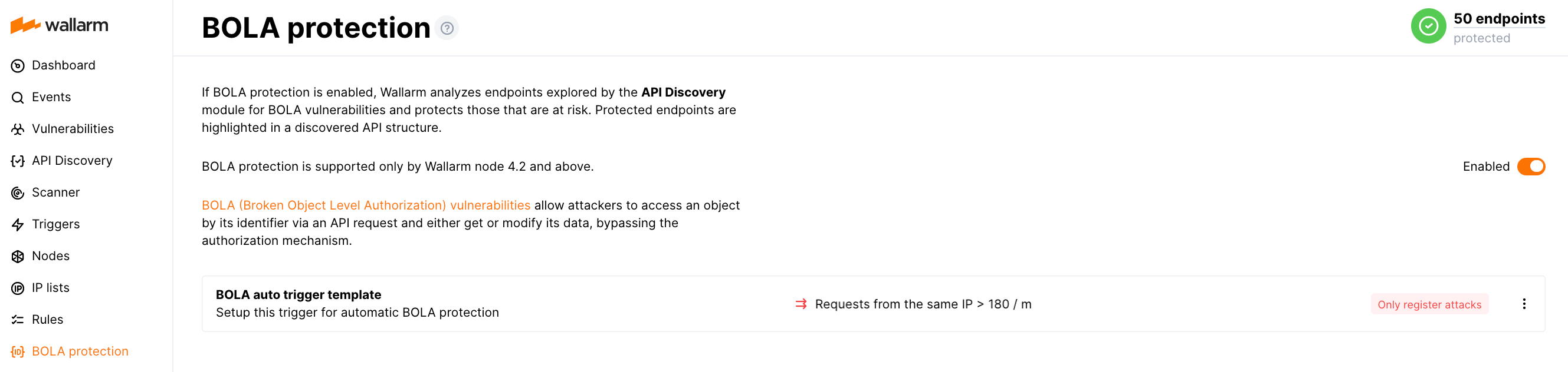 To enable auto protection, proceed to Wallarm Console → BOLA protection and turn the switch to the enabled state: