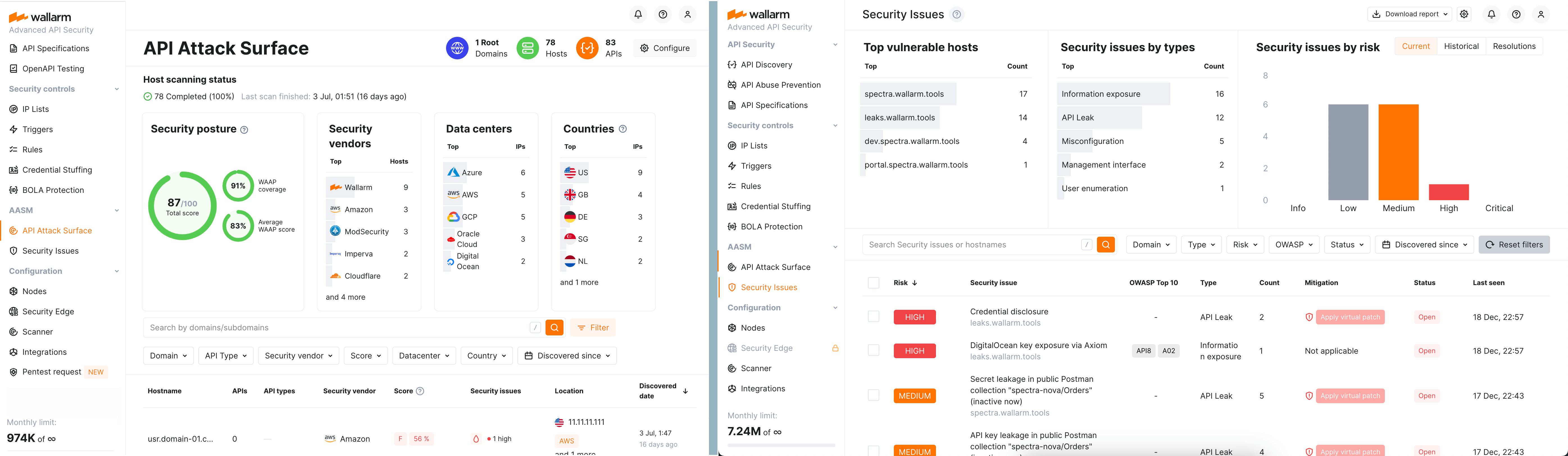 Wallarm's API Attack Surface Management (AASM) is an agentless detection solution tailored to the API ecosystem, designed to discover external hosts with their APIs, identify missing WAF/WAAP solutions, and mitigate API Leaks and other vulnerabilities.
