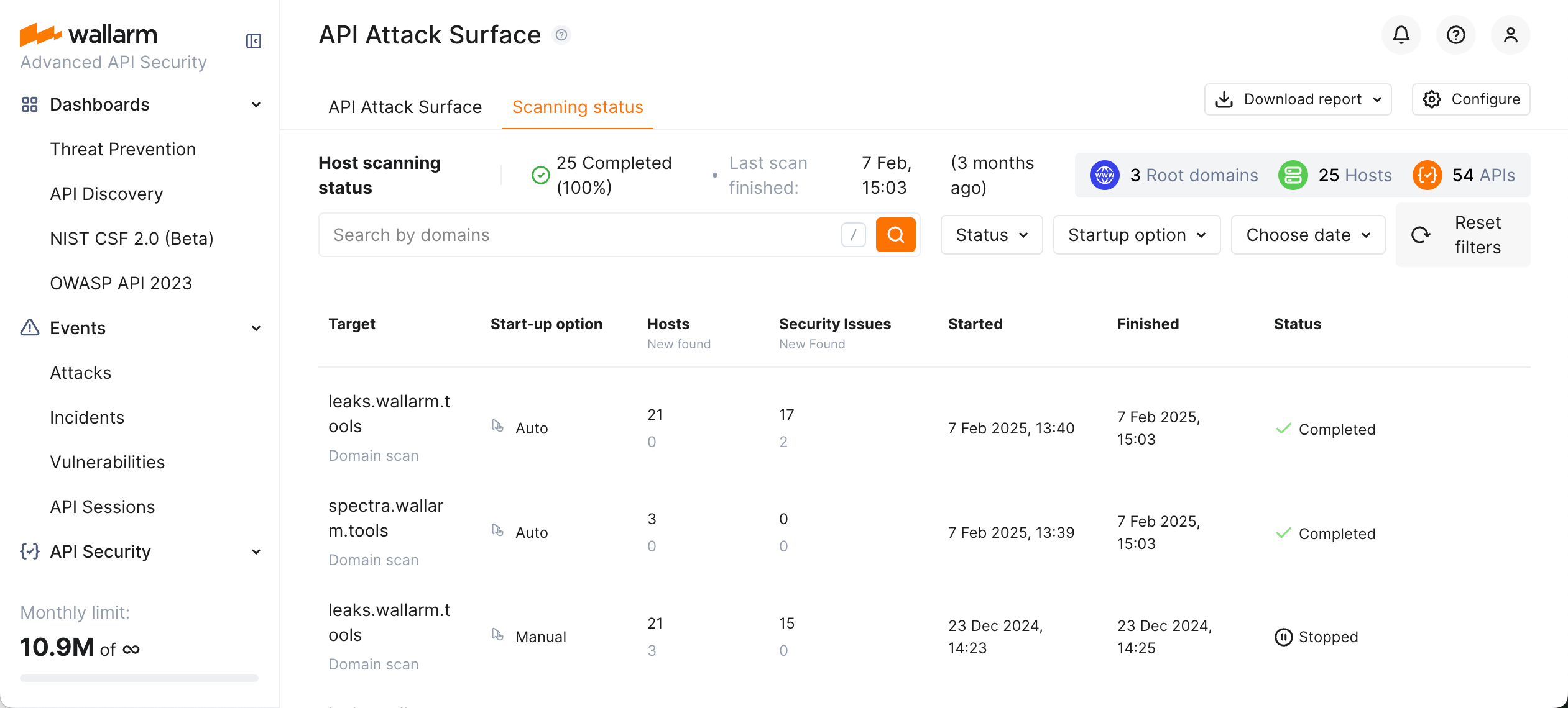 A brief information about when your domains were added to the scope and last scanned is presented at AASM → API Attack Surface → Configure → Domains and hosts.