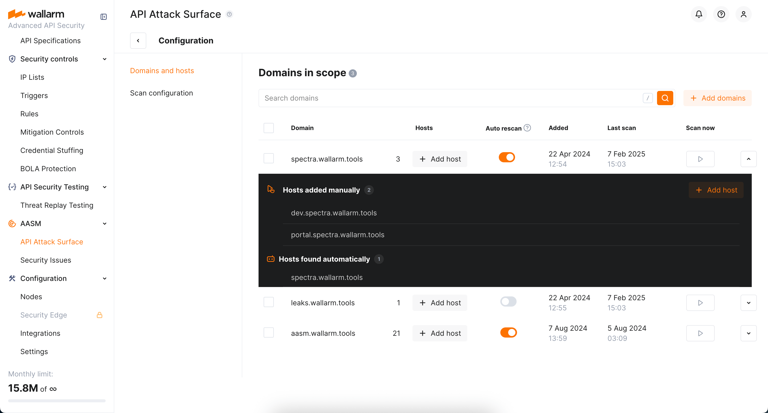 You can start scanning for any domain manually at AASM → API Attack Surface → Configure → Domains and hosts by clicking the Scan now button.