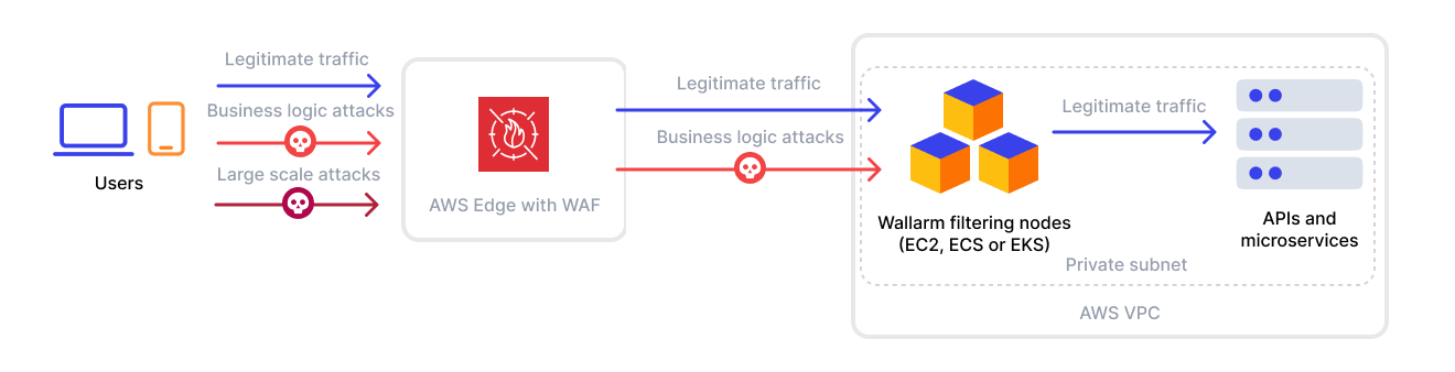 A common model is ALB + AWS WAF → Wallarm → Application. Wallarm supports flexible deployments - inline behind ALB, as an ingress in EKS, or behind API Gateway or CloudFront origins - without requiring major changes to infrastructure. Its compatibility with standard AWS networking lets it protect both public and internal traffic paths.