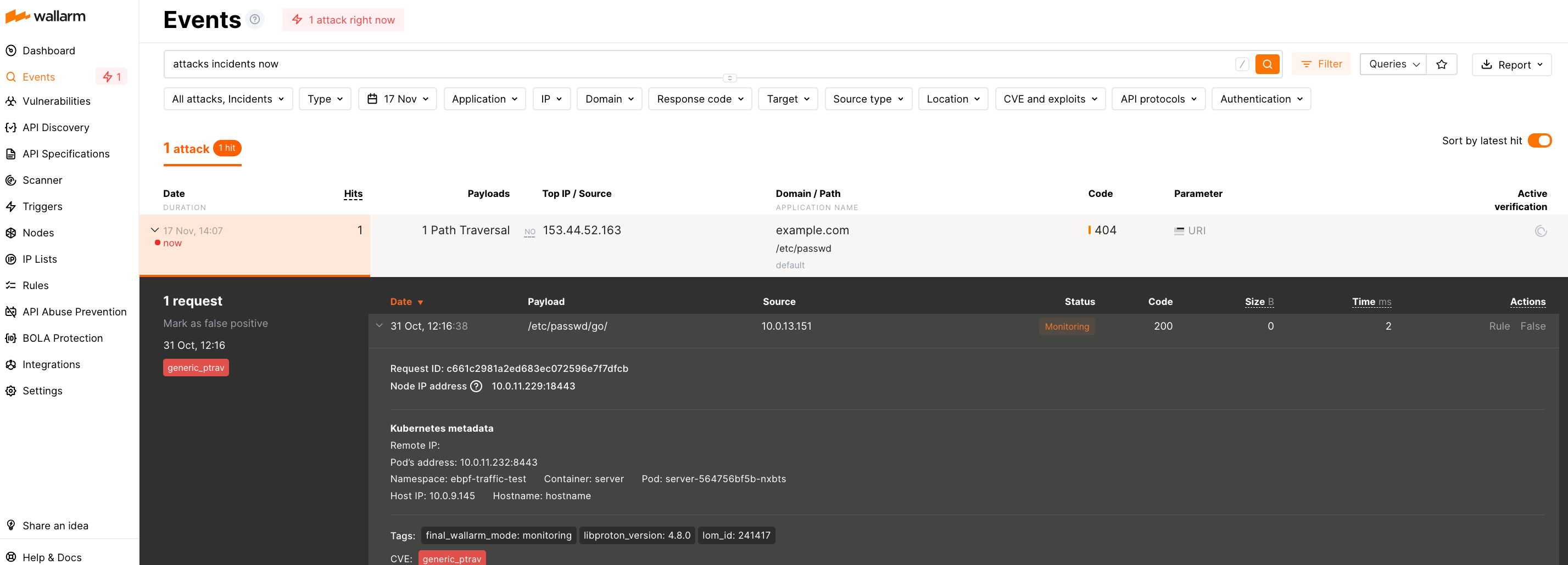 Since the Wallarm eBPF solution operates in the out-of-band approach, it does not block attacks but only registers them.