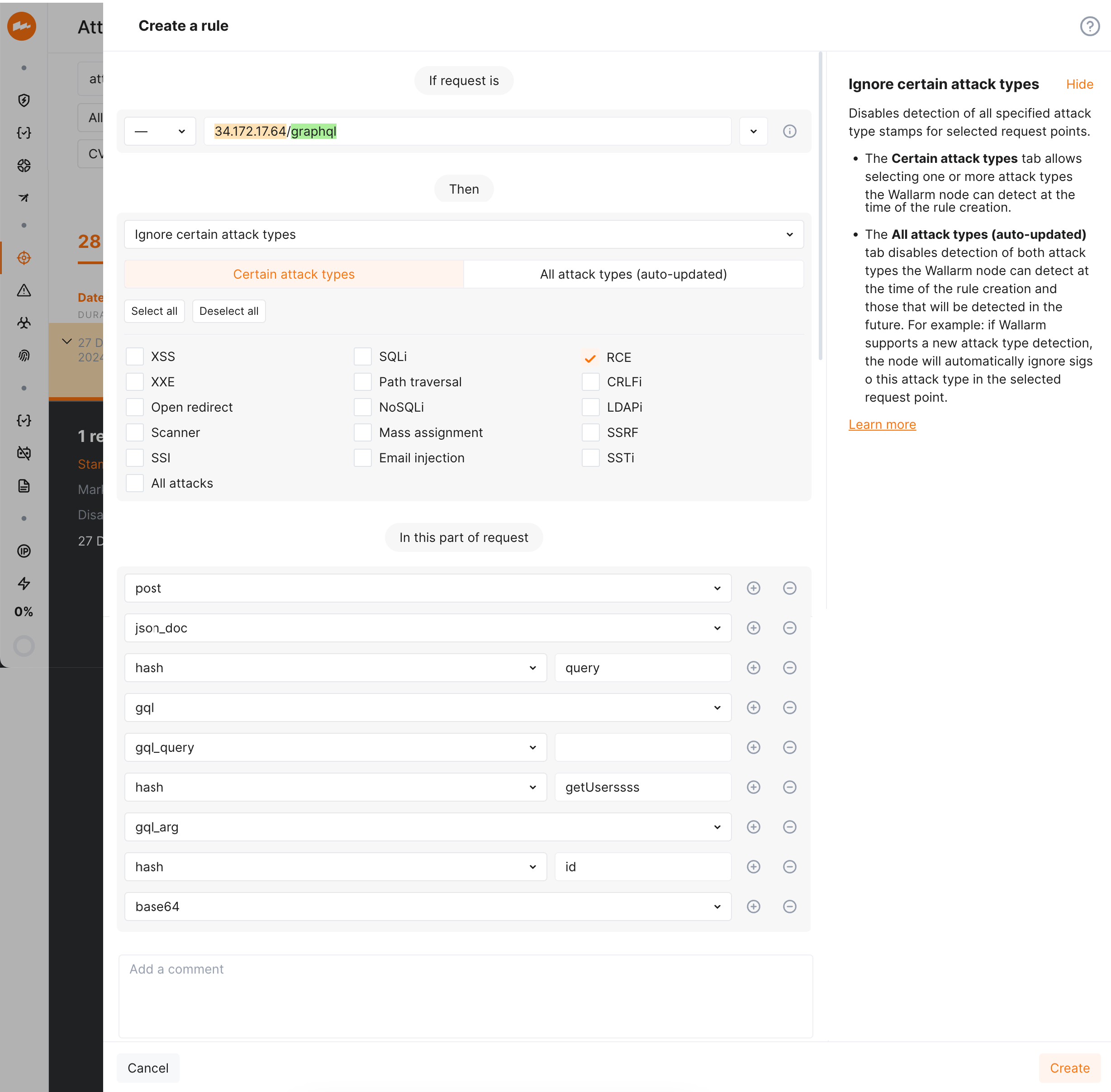 While always enabled parser by default provides detection of regular attacks (SQLi, RCE, etc.) in GraphQL, Wallarm also allow configuring protection from GraphQL-specific attacks.