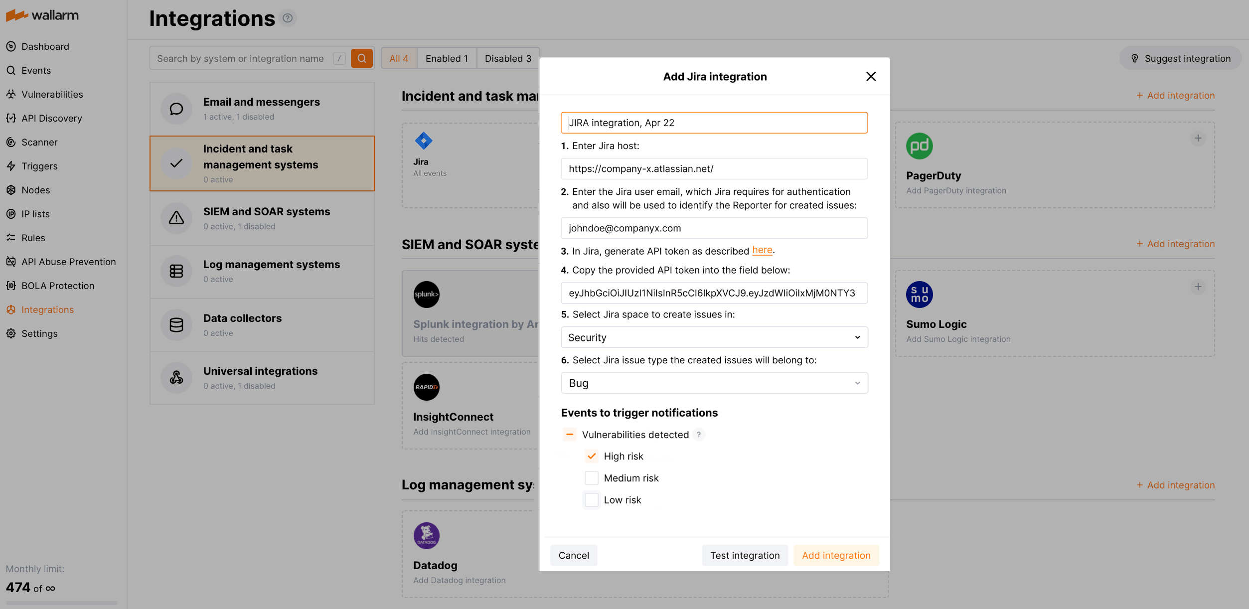 9. Click Test integration to check configuration correctness, availability of the Wallarm Cloud, and the notification format.