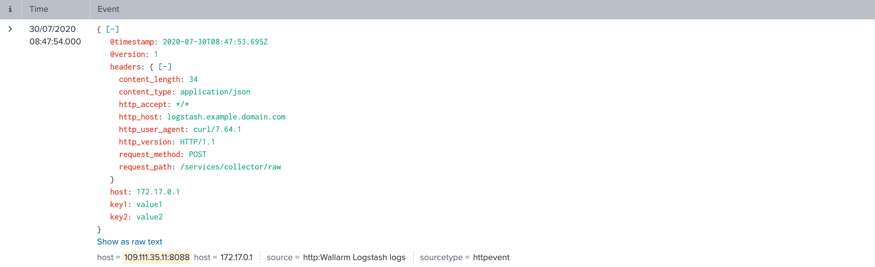 Logstash logs are sent to Splunk HTTP Event Controller with the name Wallarm Logstash logs