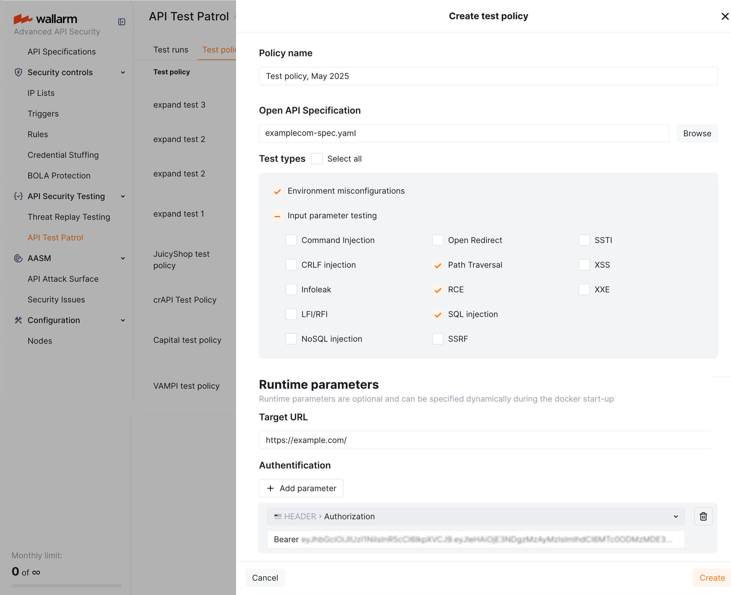 1. Go to Wallarm Console → API Security TestingAPI Test PatrolTest policies.