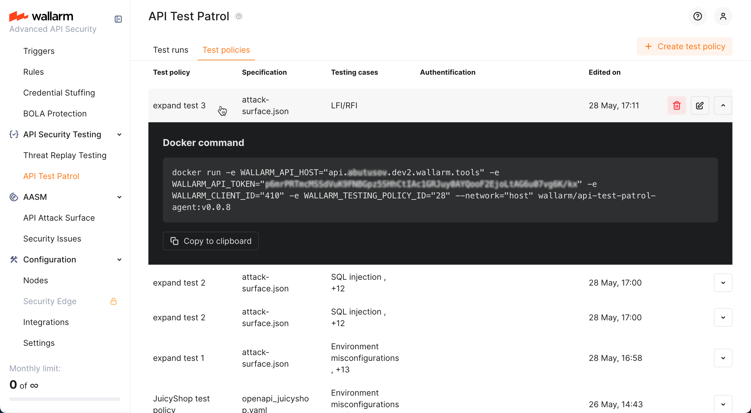 As test policy is created, it provides you with the Docker run command which allows you start tests for your application: